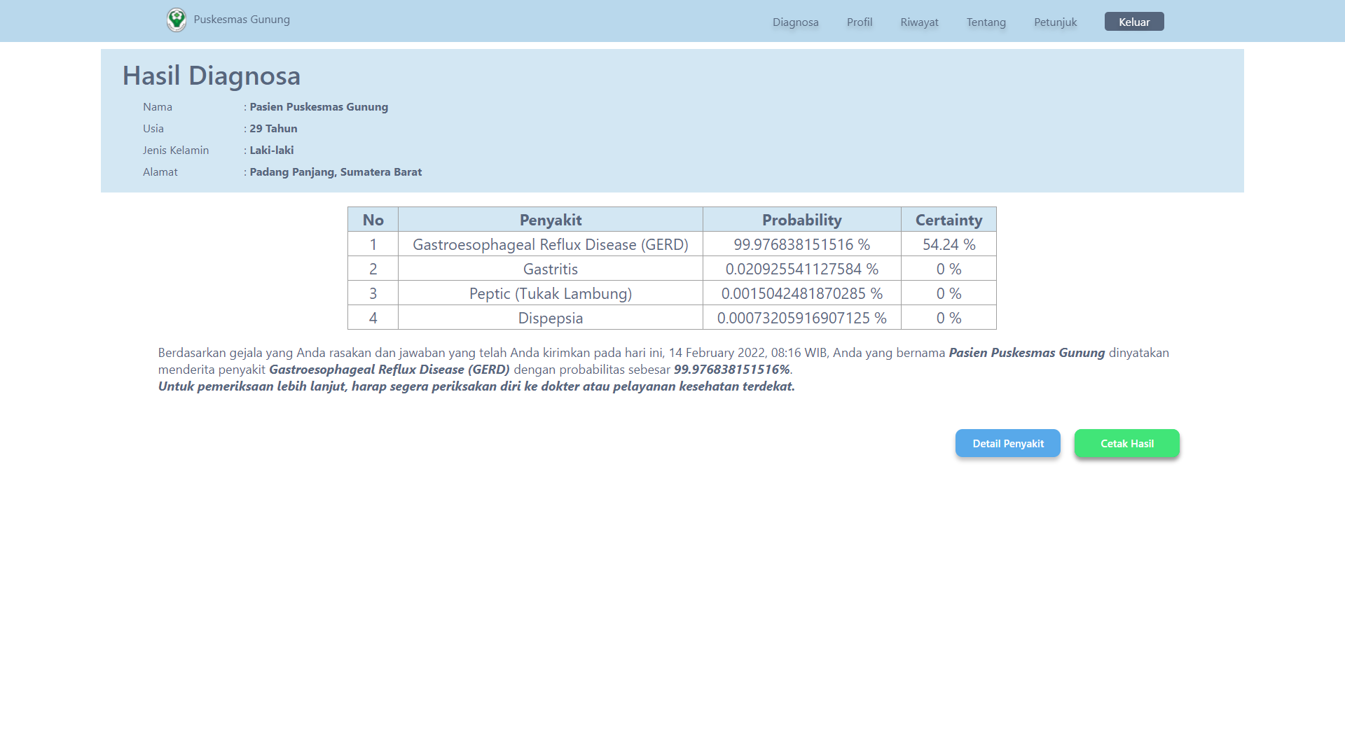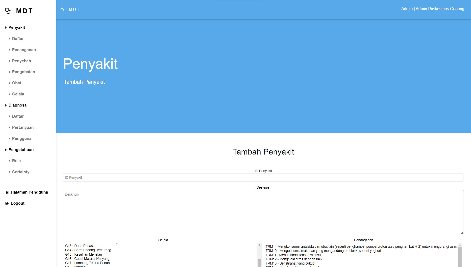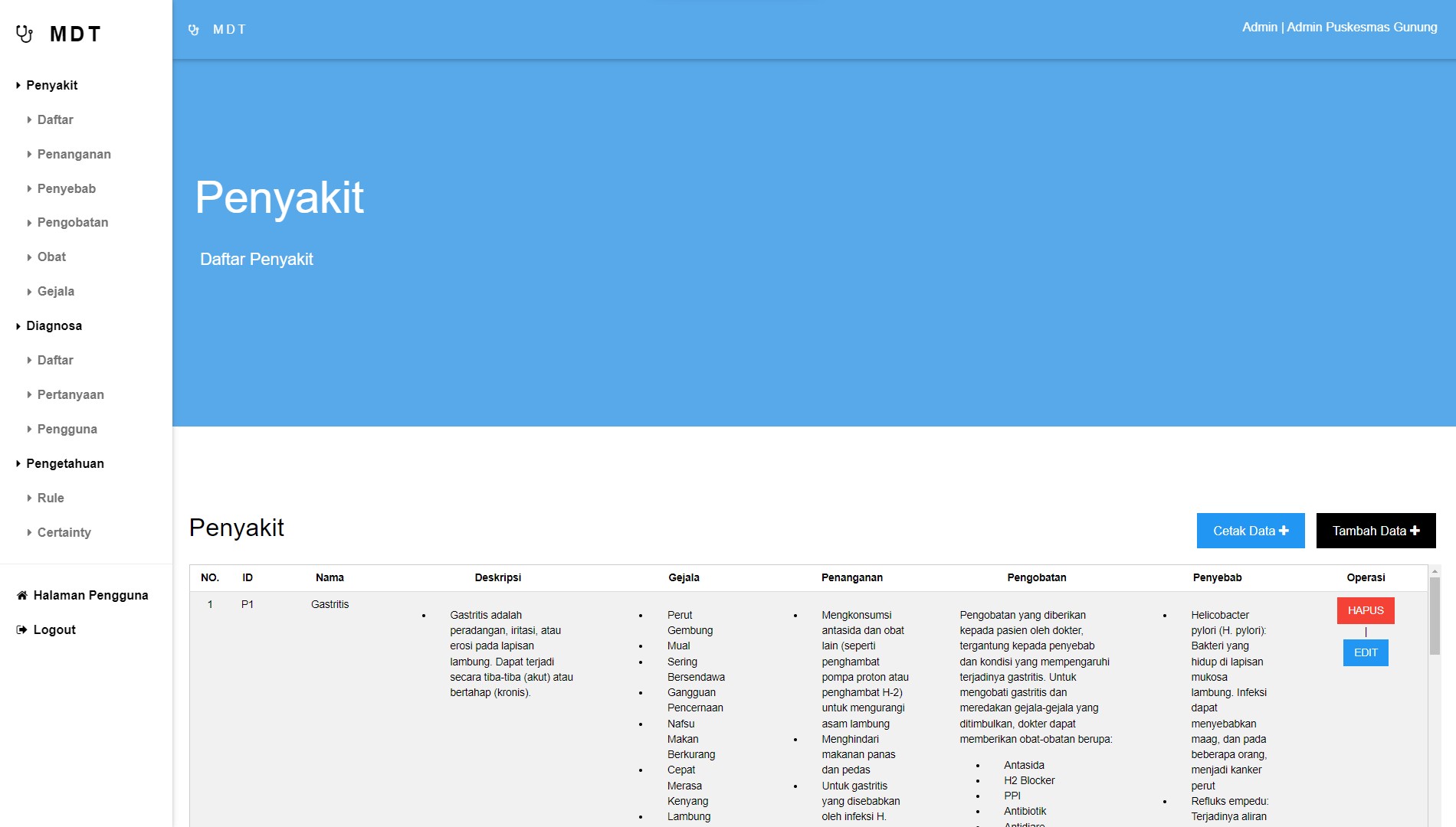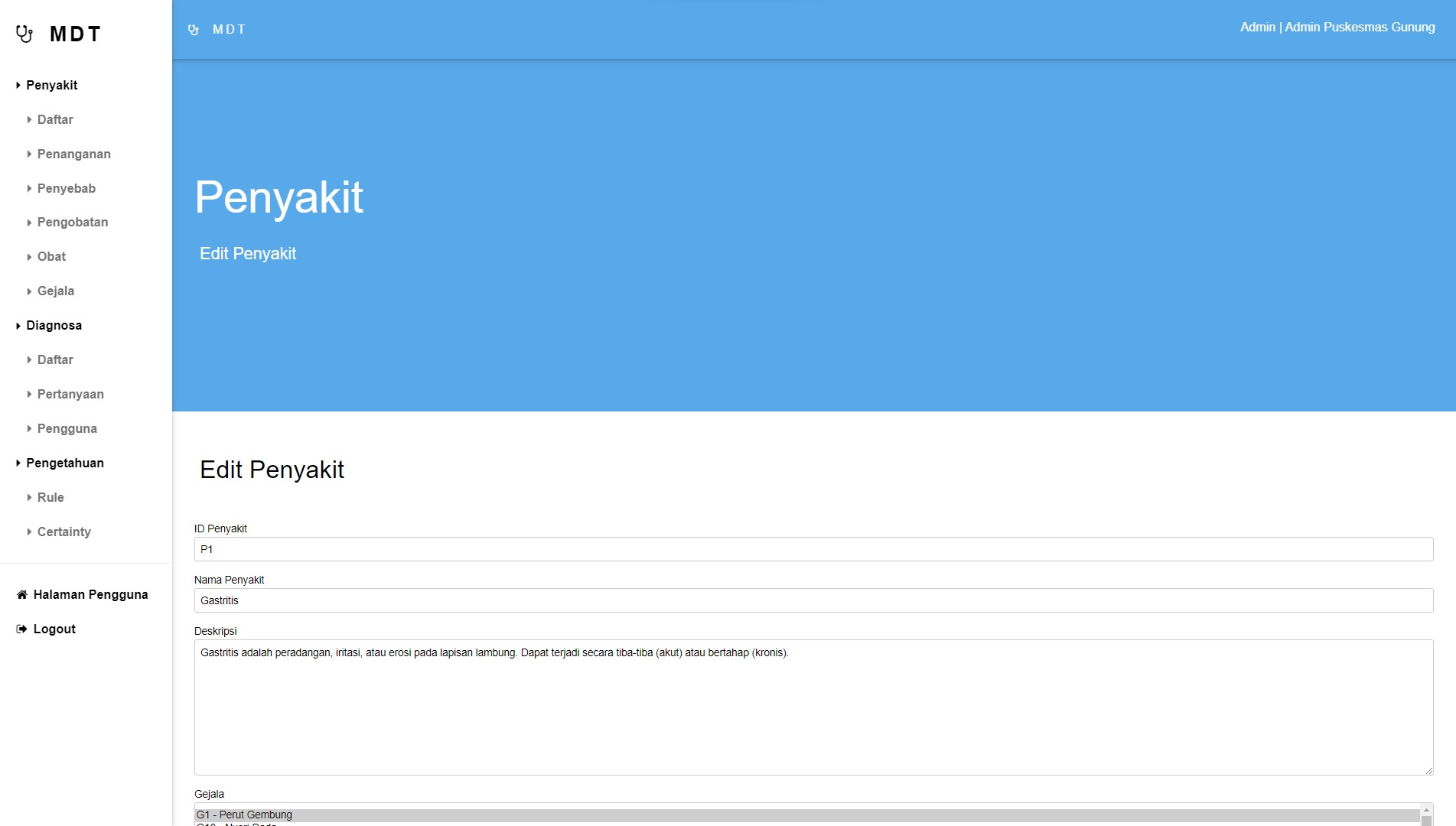 This expert system for diagnosing gastric diseases was created to help speed up and make it easier for health center doctors to diagnose patients, and was also created for the wider community to carry out initial diagnoses of the gastric diseases they suffer from