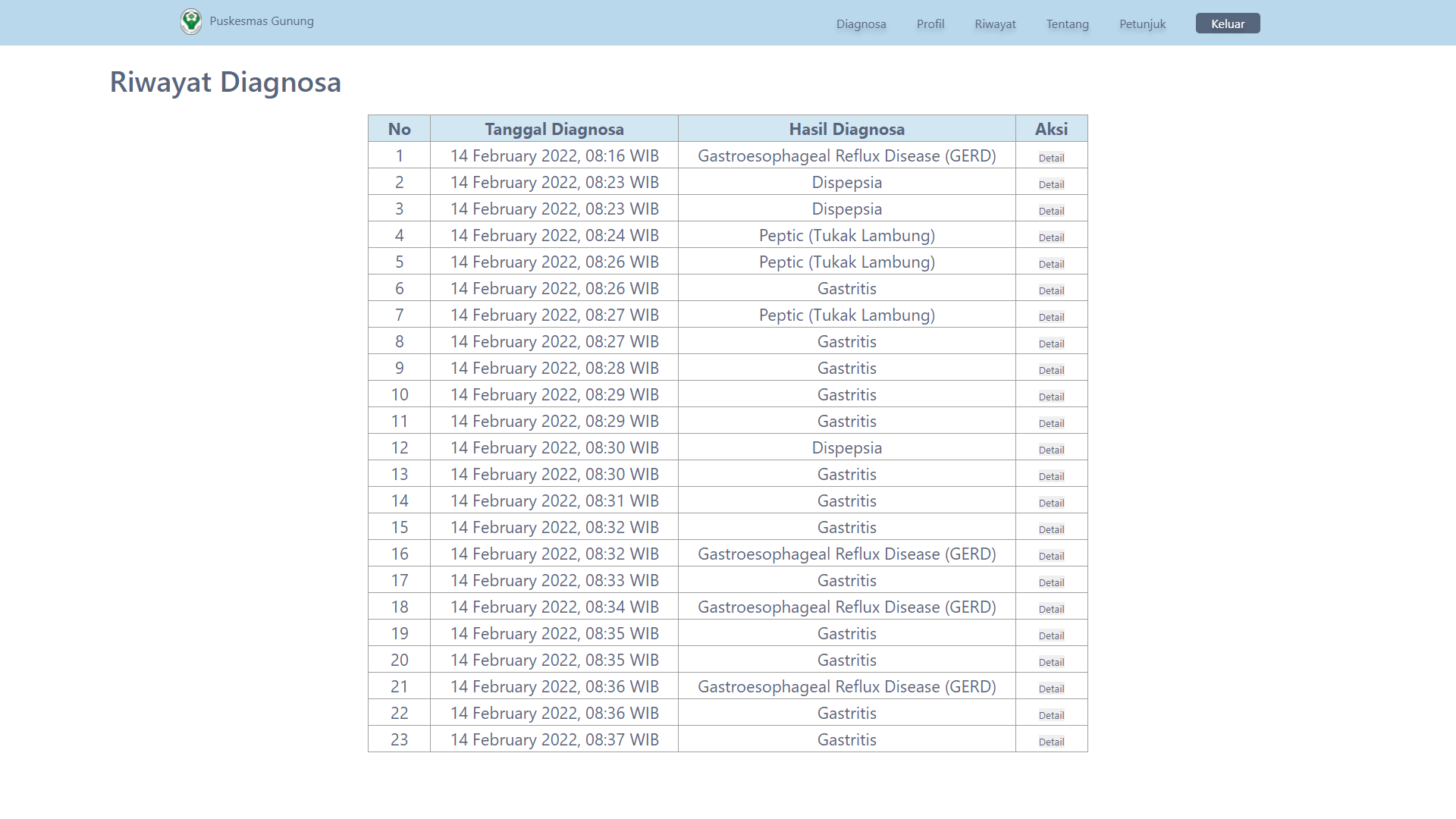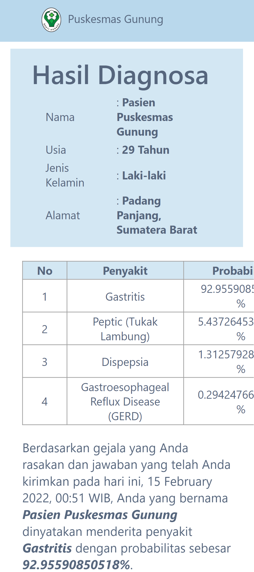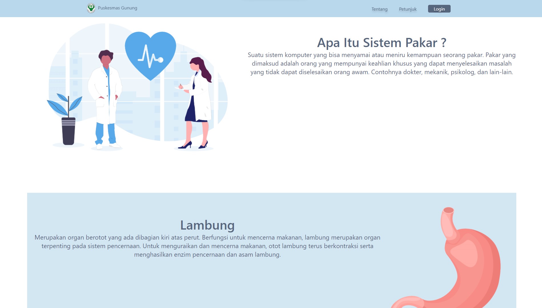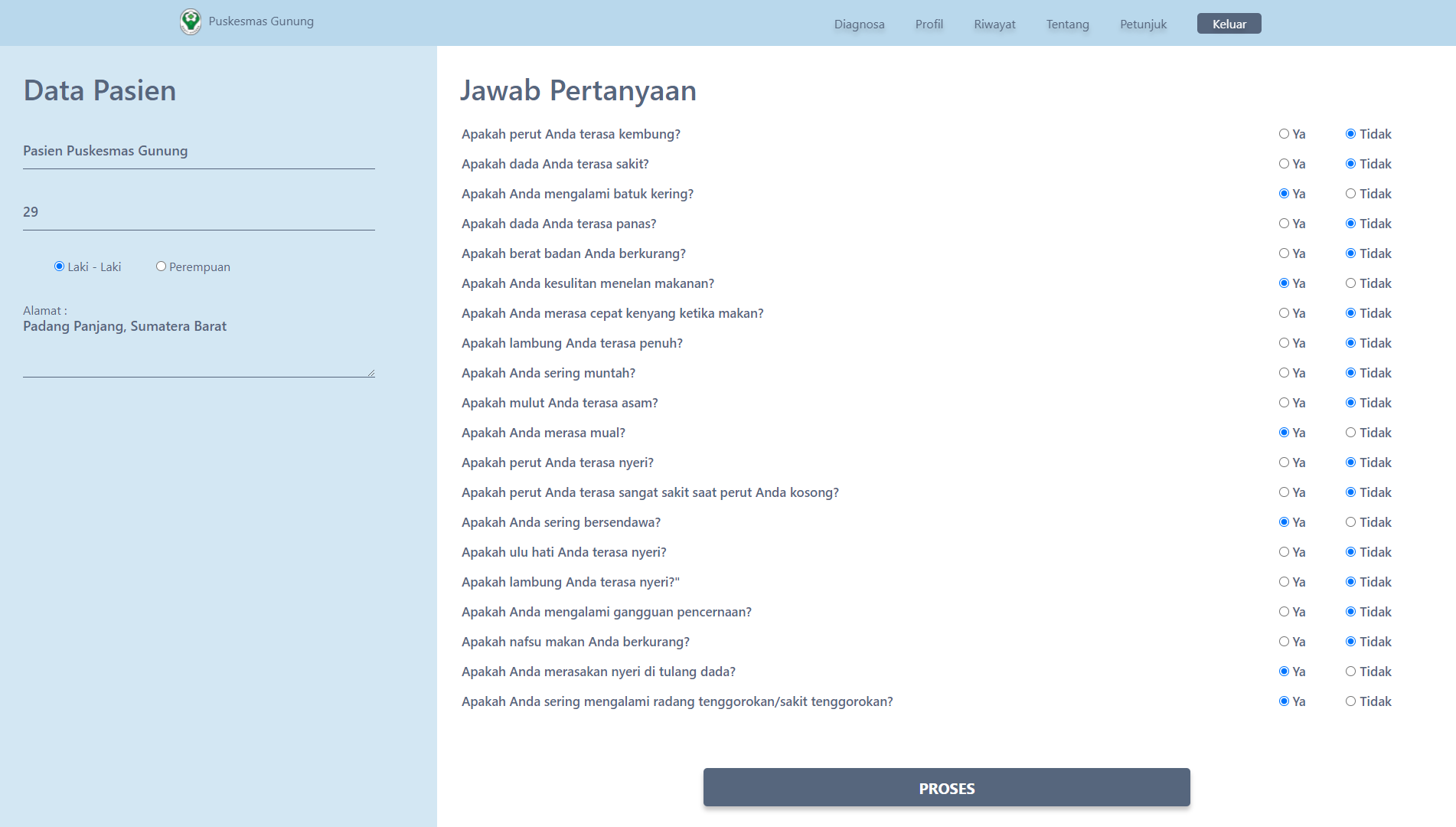 This expert system for diagnosing gastric diseases was created to help speed up and make it easier for health center doctors to diagnose patients, and was also created for the wider community to carry out initial diagnoses of the gastric diseases they suffer from